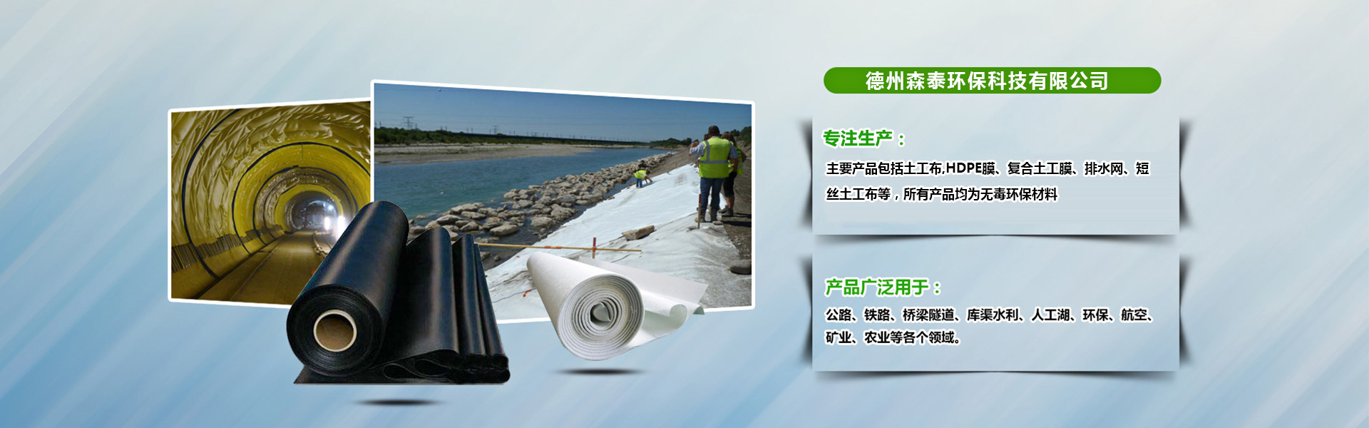 德州泰环保U技有限公司Q森泰环保专注于水利、环境及生态修复技术研发及产品刉,q有专业的施工工E技术服务团队。已完成水利工程100多项Q环境工E?00多项Q典型工E包括南水北调工E、三峡工E、߀沱河防渗工程Q保定环城水pdE、济南垃圑֡埋场工程Q桂林垃圑֡埋场工程、大同电(sh)厂防渗工E、嘉兴火车站防渗工程、黑龙江农垦防渗工程{。森泰环保主要品包括土工布,HDPE膜、复合土工膜、排水网、短丝土工布{,所有品均为无毒环保材料,可广泛应用于Q?.环境修复工程Q粮食基地土壤改良、工业场地、矿业、水体等工程、蔬菜大?LQ种植等Q?.水利工程Q江x库、堤坝的防渗加固、水渠的防渗、护坡等Q及市政防渗Q地铁、徏{物的地下工E、种植屋面、屋花园的防渗、污水管道内衬等Q?.....
